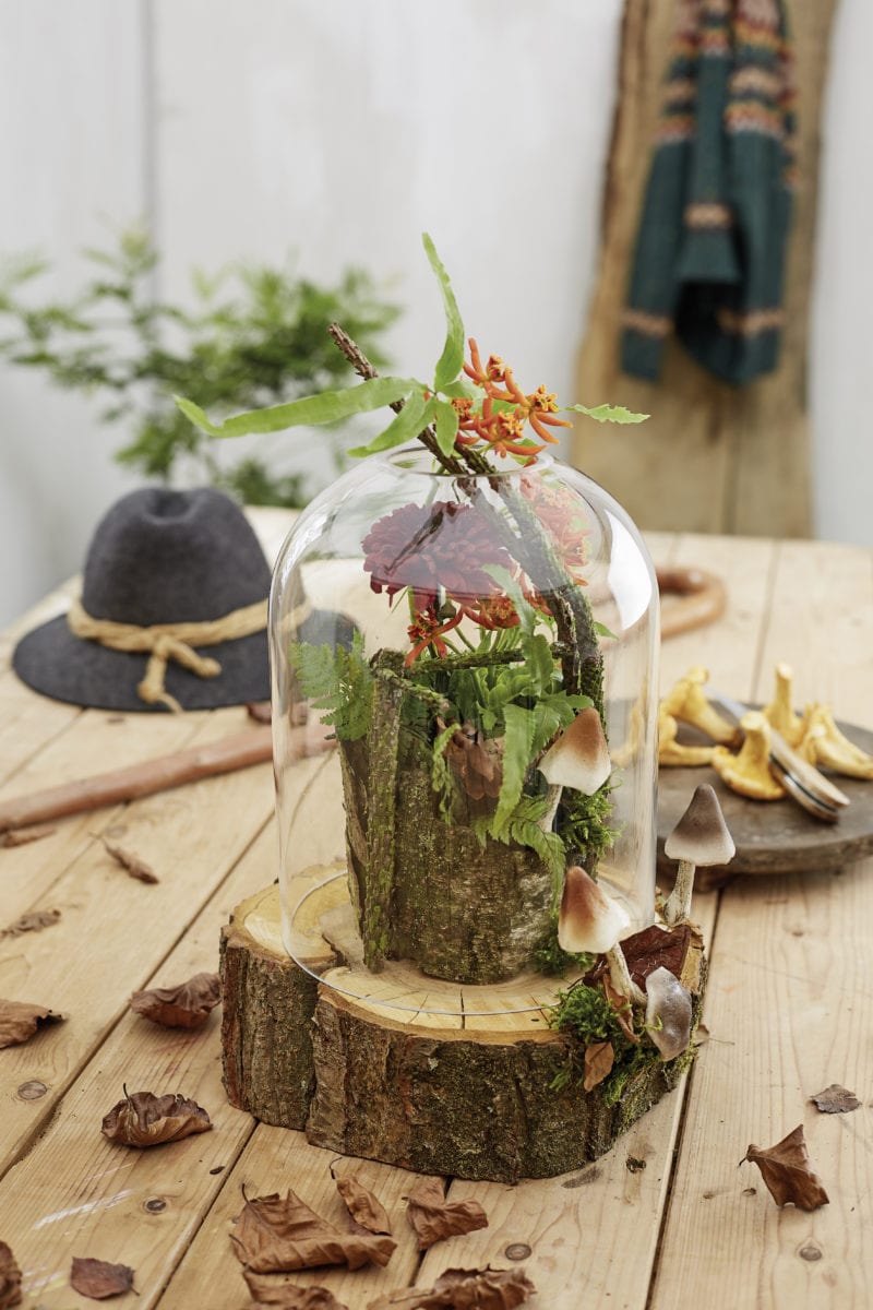 Die Hälfte des OASIS® BIOLIT® Kranzes mit solchen Moospolstern bestecken und trockene Trichterpilze hinzufügen. Dann die verbliebene Kranzhälfte mit Blütenwerkstoffen gestalten.